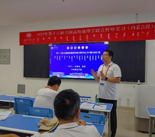 讲座结束后,中期汇报有序开展。各高校实习小组依次就内蒙古段近几日的实习成果进行总结汇报,内容涵盖乌兰布和沙漠考察、三盛公水利枢纽调研、库布齐沙漠治理观察、包头城市转型探究及草原生态水文考察等方面,重点呈现了实地观察所得、理论应用情况及初步研究思考。评委老师对各小组的实习成果予以点评,肯定亮点的同时提出针对性改进建议,助力同学们完善实习报告,深化对地理问题的系统性认识。