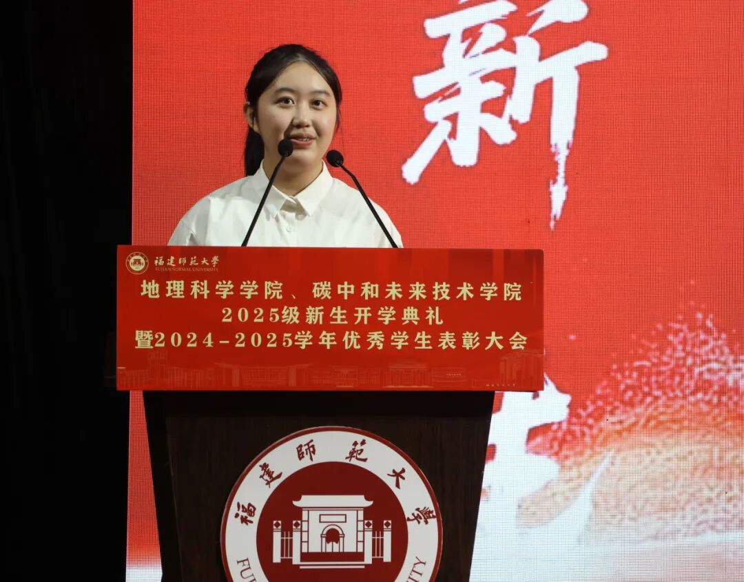 2025级地理科学类专业本科生戴秀林代表全体2025级新生发言,她表达了初入大学校园的无限憧憬,倡导大家既要向上生长,不断拓展知识的高度,又要向下扎根,夯实专业基础。她呼吁全体2025级新生秉持家国情怀,努力突破自我、追求卓越,成为堪当大任的时代新人。
