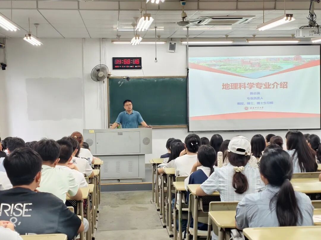 地理科学专业介绍会由地理科学专业负责人陈志强教授主讲。陈志强教授从专业概况与院系历史入手,为2025级新生全面解析地理科学专业的专业特色与发展路径。他强调,师范生应重视学业与就业的双重训练,提前完善职业规划,苦练教学基本功,提升专业素养,为将来走向教育岗位夯实基础。陈志强教授还详细介绍了大学四年的学习方向与各学年的重点任务,鼓励学生主动探索学科知识,培养专业探知欲。最后,他勉励同学们明确奋斗目标,珍惜光阴,努力成长,在大学学习生活中劈波斩浪、勇毅前行。