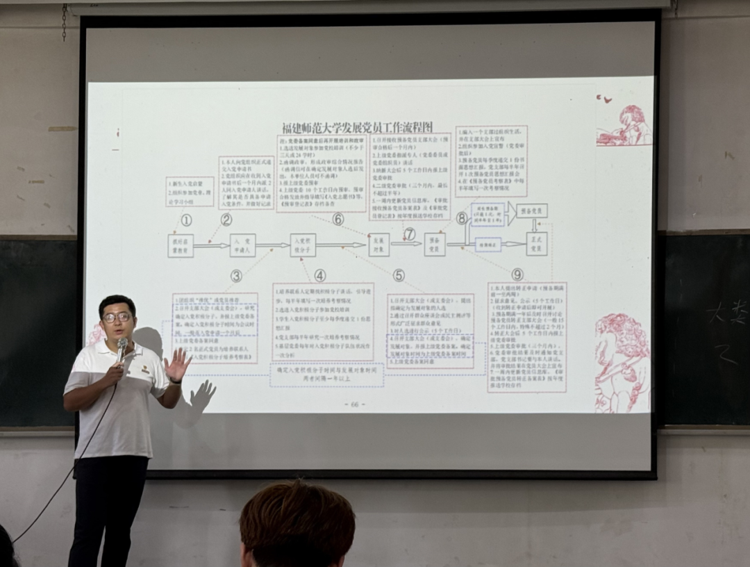 郑晨宇老师从中国共产党的百年奋斗历程出发,系统而生动地讲述了中国共产党带领中国人民实现了从站起来、富起来到强起来的伟大飞跃,帮助同学们深刻理解中国共产党的性质、宗旨和中国共产党人的初心使命。随后,他对入党流程、党员的权利与义务、党支部日常工作与活动等内容进行了细致梳理,并重点讲解了入党申请书的写法,使新生对党组织有了更加全面的认知。