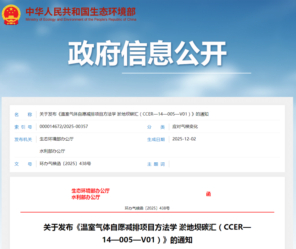 关于发布《温室气体自愿减排项目方法学 淤地坝碳汇(CCER—14—005—V01)》的通知 https://www.mee.gov.cn/xxgk2018/xxgk/xxgk06/202512/t20251202_1136958.html