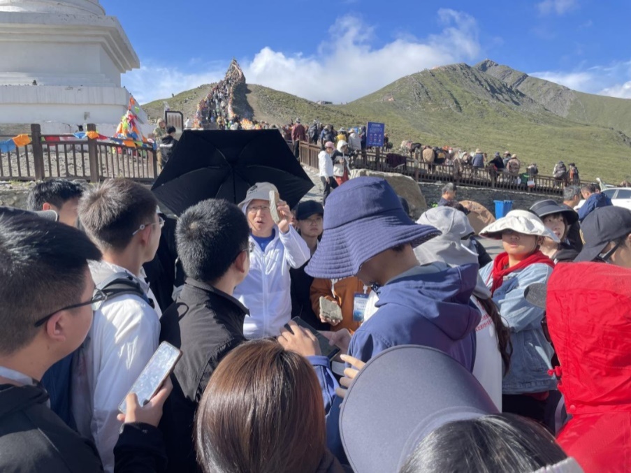 川西高原的折多山分水岭是重要的地理分界线,其西面是高原隆起地带,地形起伏平缓,东面是高山峡谷地带,高差悬殊。实习车队行进在折多山时,同学们可以观察到道路两侧山坡上的植被差异,近距离进行草甸和稀树草原景观的对比;认识折多山高海拔低山丘陵地貌特征及该地区河流地貌典型特征,高山常见流石滩的原因等;同时,每个人都深刻感受到高原高寒缺氧的地理环境对人体的影响。
