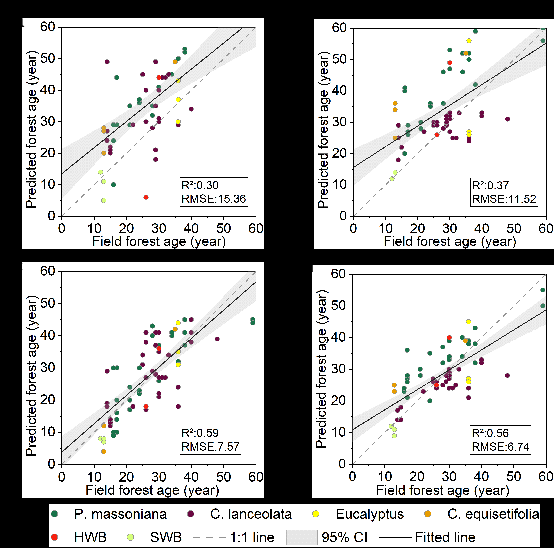 图1. 森林年龄反演精度图:(a, b)基于GDEI的树高数据(Potapov et al. 2021);(c, d)基于GDEI和ICESat-2的树高数据(Liu et al. 2022);(a, c)使用理论生长方程Logistic方程;(b, d)使用随机森林算法。