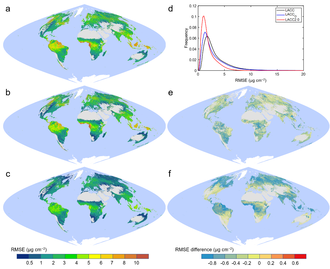 局部自适应三次样条时间序列插值算法(LACC)在全球植被生物物理和生化参数的时间序列重建中因其有效性而受到广泛认可。但在应用中,我们经常遇到如下问题:植被生化参数的正向偏差异常值和长时间连续缺口会对插值产生较大的影响。为解决上述问题,我们通过异常值过滤和时空融合来升级LACC算法(即LACC2.0)。以全球叶片叶绿素含量(LCC)为例,在全球尺度上逐像元构建LCC参考曲线作为全球评估的真实值,并通过在真实观测中模拟高斯噪声和数据缺失来构建测试数据,以验证新算法对LCC重建的有效性和适用性。结果显示,RMSE小于5μg/cm2的像素百分比从81.2%提高到96.4%(图2),表明LACC2.0可为全球逐日遥感植被生化参数提供更好的重建。这一发现也突显了异常值去除和时空融合对提高时间序列重建的准确性和可靠性的重要性。