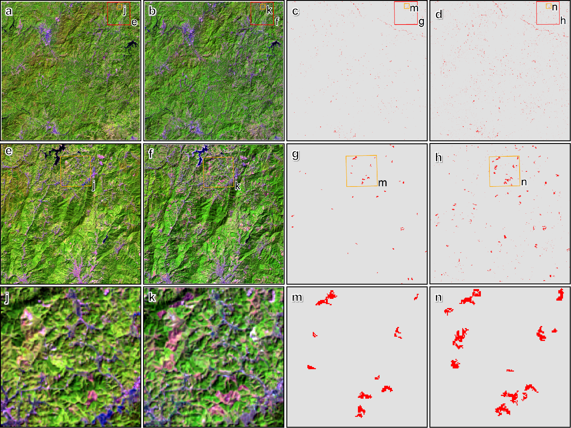 图3. 扰动监测结果对比图:(a, b, e, f, j, k)为扰动前后的假彩色合成图像,(c, g, m)为原始LandTrendr监测结果图,(d, h, n)为改进算法mLandTrendr的监测结果图。