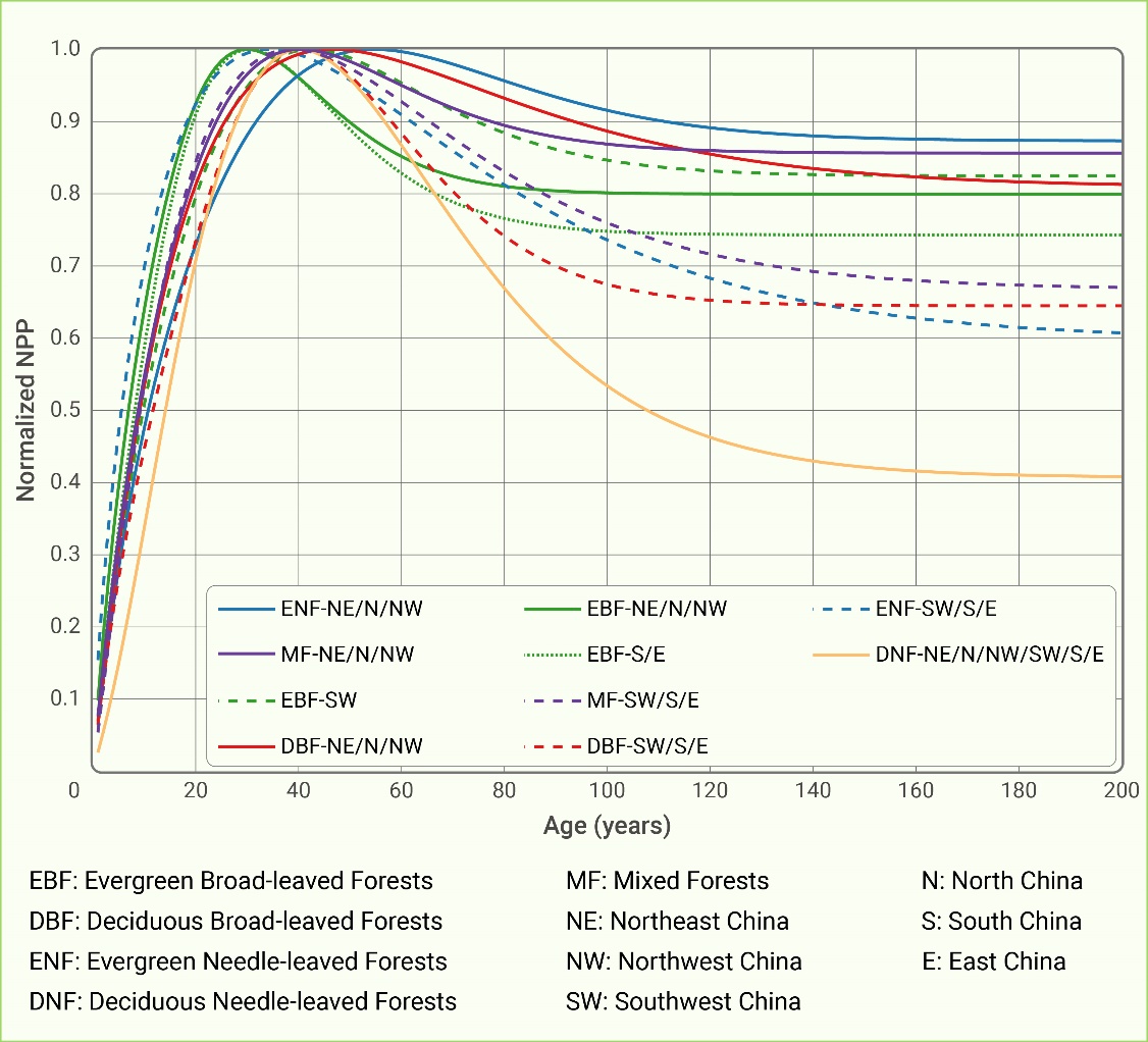 图2. 中国不同森林覆盖类型和分区的森林生长曲线图