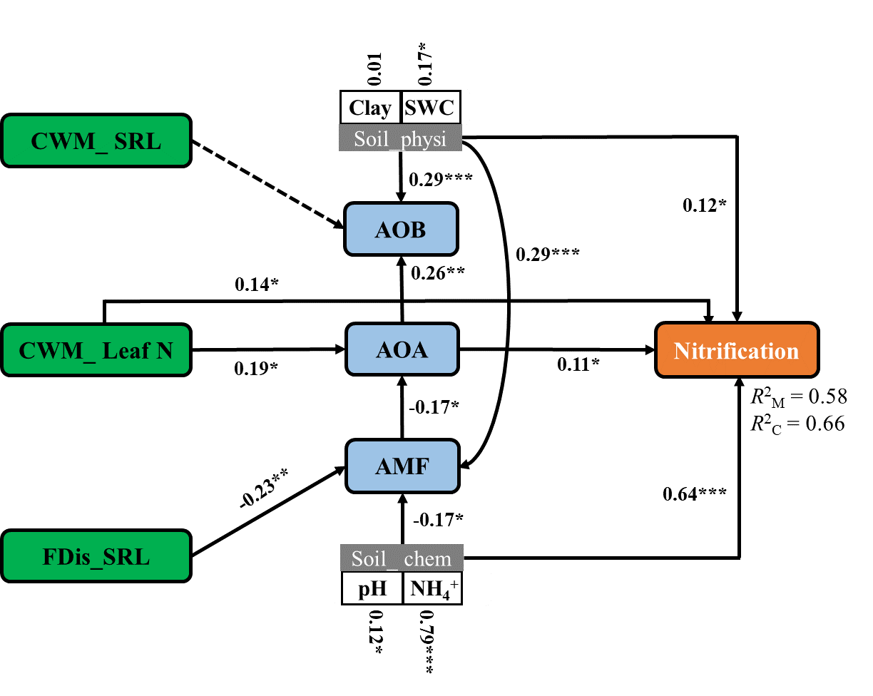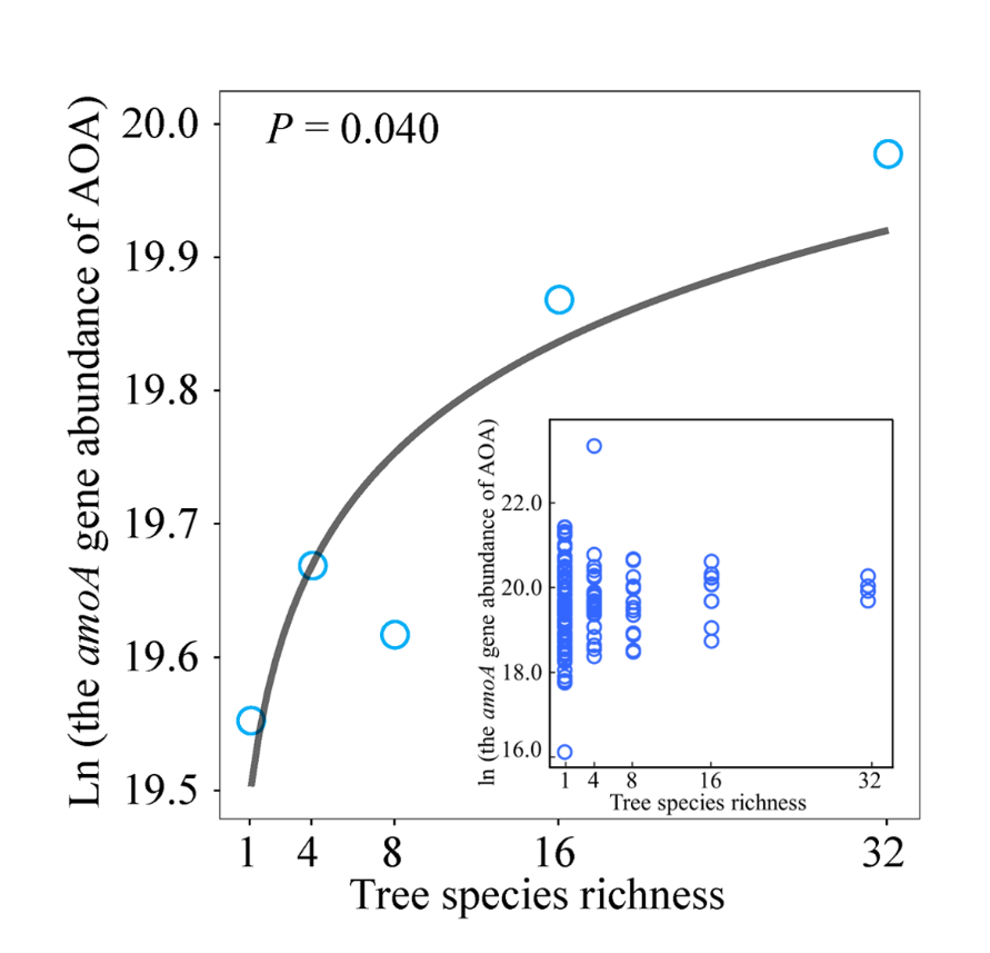 树木多样性与森林生态系统功能密切相关。硝化作用是森林生态系统氮素生物地球化学循环的重要组成部分。但树木多样性影响土壤硝化作用的潜在机制仍不清楚。因此,研究团队依托在福建龙岩建立的“树种多样性与生态系统功能实验平台”,评估了树种丰富度和树木功能组成对土壤氨氧化古菌、氨氧化细菌和丛枝菌根真菌丰度的影响。结果发现:(1)树种丰富度与氨氧化古菌丰度呈正下凹关系;(2)资源获取型功能性状,如较高的叶片氮含量和比根长均显著提高了氨氧化微生物的丰度;(3)比根长的功能性状多样性通过对丛枝菌根真菌生物量的负面影响而间接促进了土壤硝化作用。该研究表明树种丰富度和树木功能组成能通过增加氨氧化古菌丰度促进土壤硝化作用,强调了树木多样性和功能微生物群的相互作用在预测生态系统功能中的关键作用。
