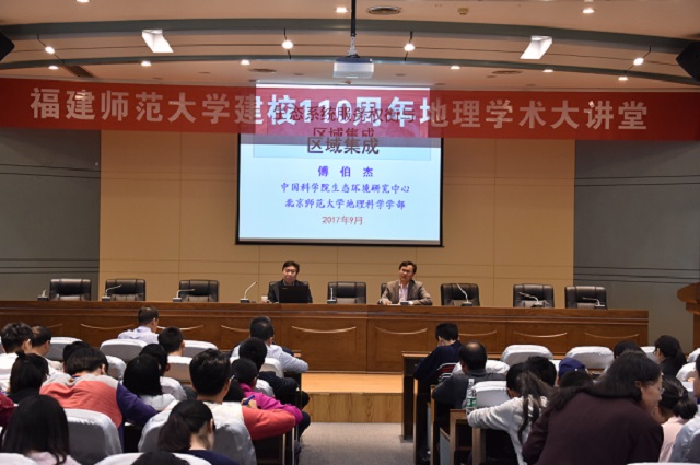 2017年11月13日下午14:00,应地理科学学院、福建省湿润亚热带山地生态国家重点实验室培育基地邀请,中国科学院傅伯杰院士莅临地理科学学院,在邵逸夫楼三楼国际学术报告厅开展题为“生态系统服务的权衡与区域集成”的学术讲座。讲座由黄志群副院长主持,自然地理学、生态学与人文地理学等多个专业的师生参加了此次报告。