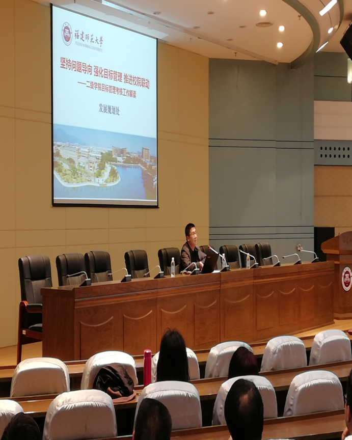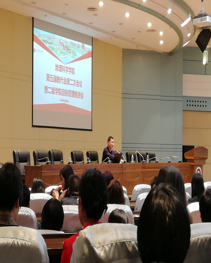 3月28日下午,我院召开了“第五届教代会第二次会议暨二级学院目标管理推进会”。会议邀请校发展规划处副处长张苏做题为《坚持问题导向、强化目标管理、推进校院联动——二级学院目标管理考核工作解读》的讲座,从改革形势与背景、考核办法与操作、学院衔接与执行等三个方面对考核工作做了详细解读,通过纵、横等多维度分析我校地理学科在争创一流学科征途上面临的机遇与挑战,生动形象地描绘了“标兵越跑越远、追兵越追越紧”的激烈竞争态势。