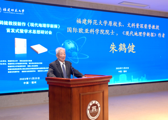 校党委书记潘玉腾在致辞中指出,《现代地理学新探》以现代地理学科学观、应用观和教育观为主轴,系统化归纳梳理结集成册,全书渗透着朱鹤健教授在高校任教70年来对学科精髓的深刻理解,充盈着对教书育人的透彻思考,对地理学人及各级各类教育教学工作者具有指导和启迪意义。这不仅是朱鹤健教授个人的著作,也是我校地理学学科的宝贵财富,还是地理学人的精神财富。