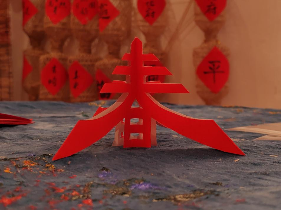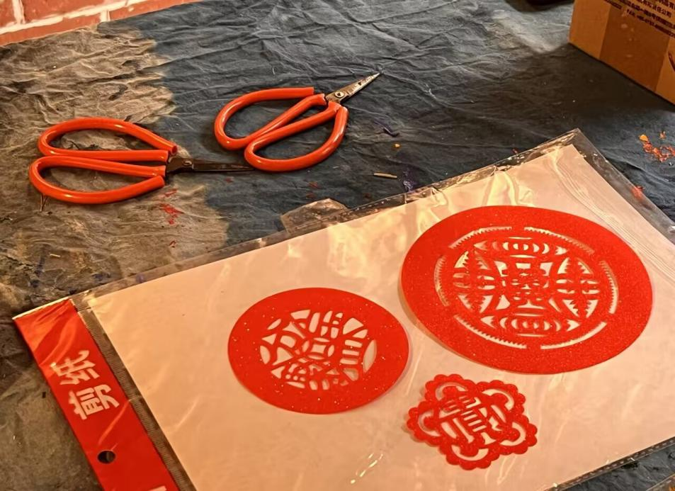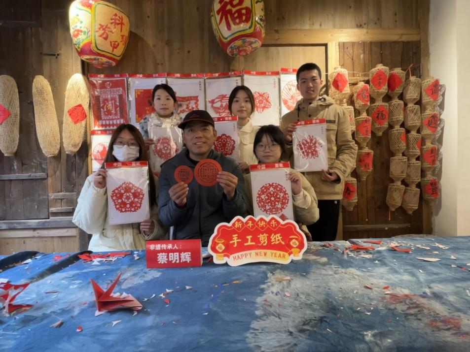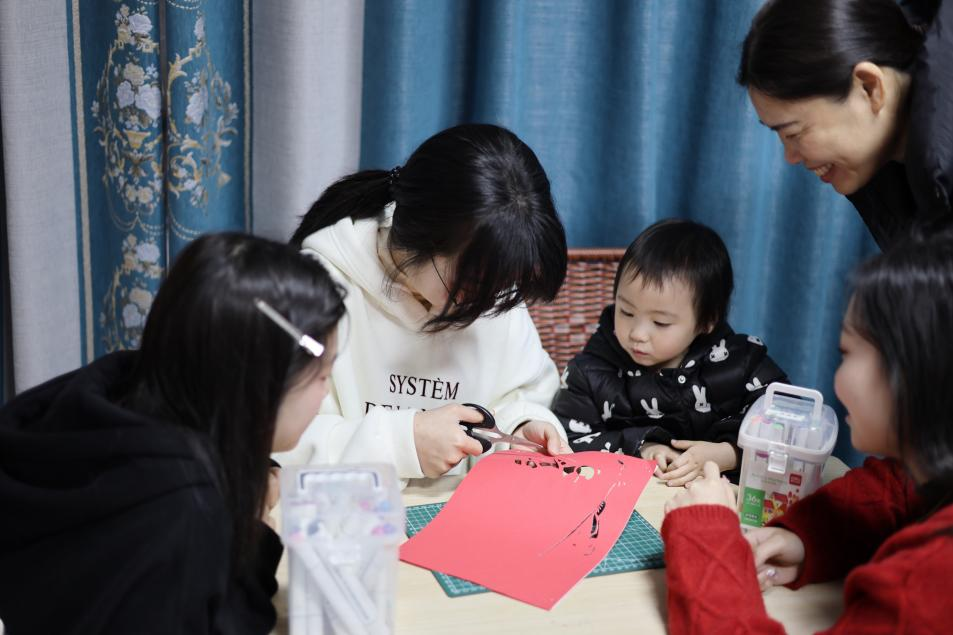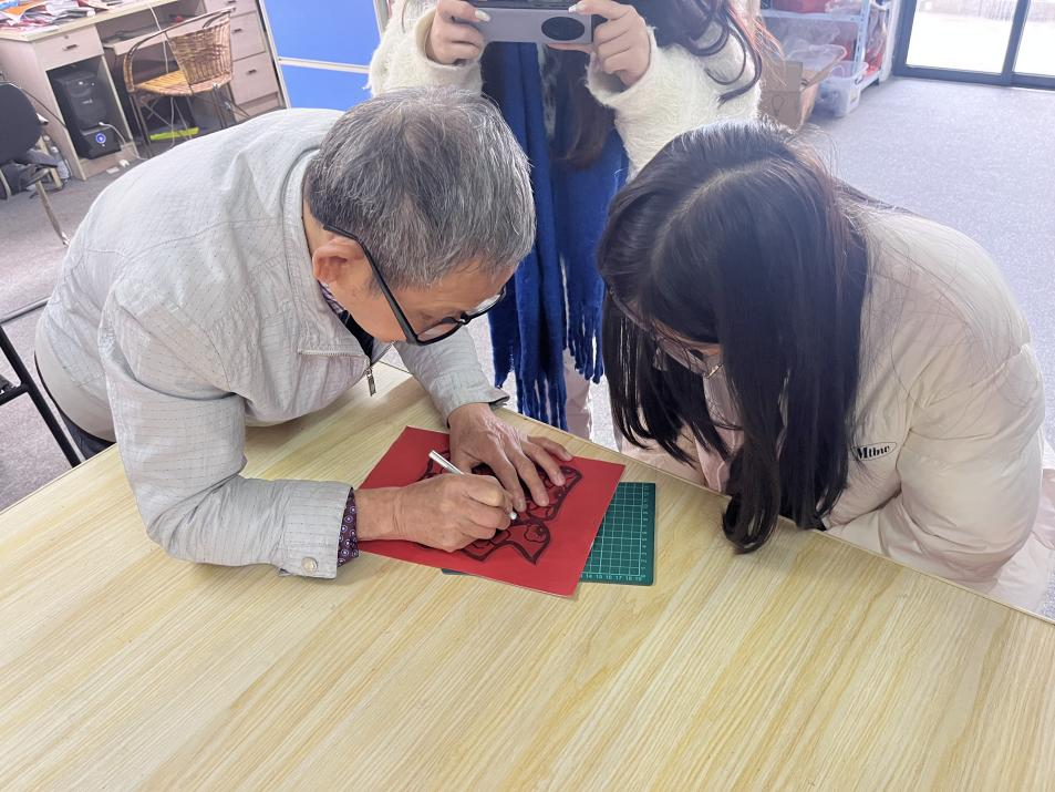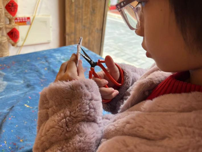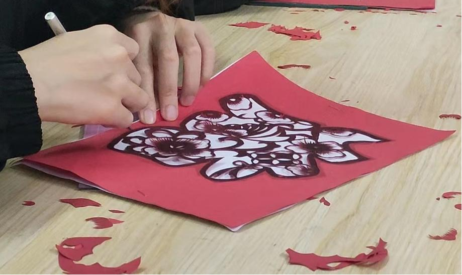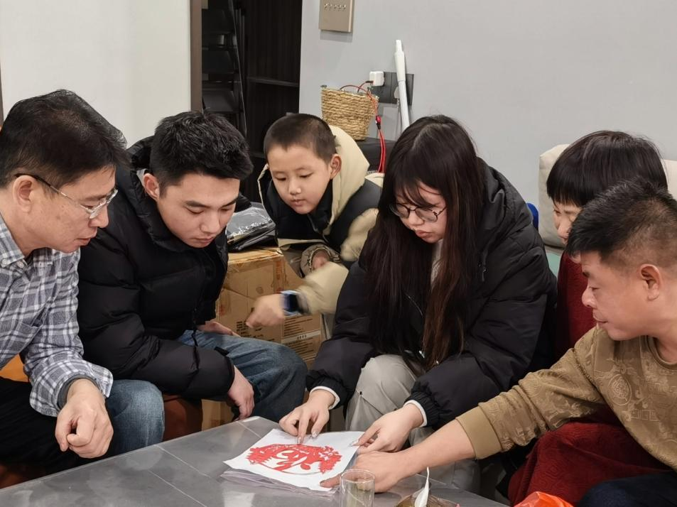 随后,实践队员在蔡老师的指导下深入学习了剪纸的理论知识和基本技法的五要素,掌握了制作剪纸过程中需遵循的“三先三后”原则,并开展创作实践,剪制了各具形态的窗花样式和立体的“春”字,深刻感受到了传统剪纸技艺中蕴含着丰富的文化内涵与价值情感。