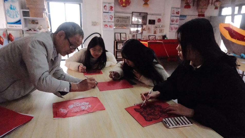 实践队成员认真学习泉州刻纸的刻刀使用及基础技法,在老师指导下亲自体验“福”图案与“龙”图案造型窗花的刻制,深刻体会了泉州刻纸古朴典雅的形象造型和深远的立意。