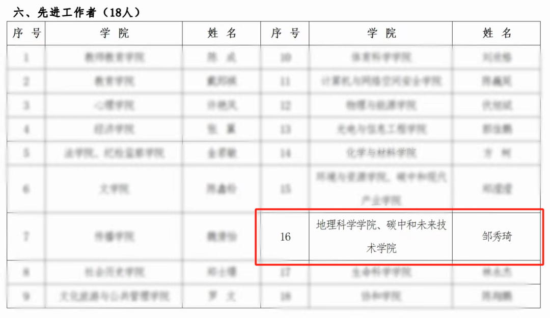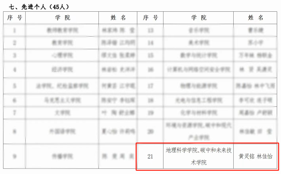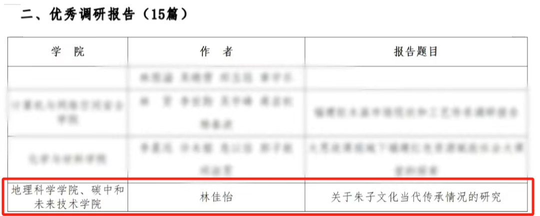 近日,校团委公布2024年福建师范大学寒假社会实践活动优秀典型表彰名单。其中,我院学子林佳怡的《关于朱子文化当代传承情况的研究》获得了“优秀调研报告”荣誉称号,我院教师邹秀琦获得了“先进工作者”荣誉称号,我院学子黄灵铭、林佳怡获得了“先进个人”荣誉称号。