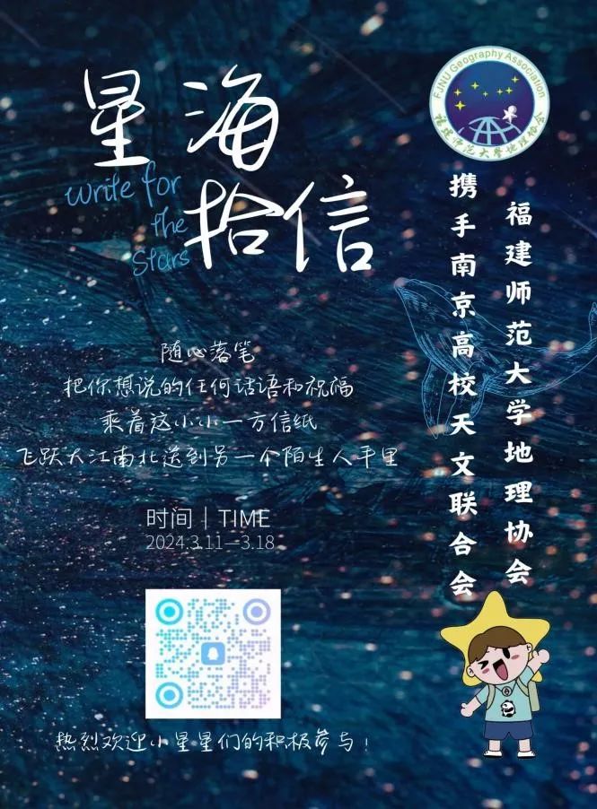 为促进各高校学子交流互动,增强社团影响力,近日,地理协会成功举办了“星海拾信”活动。本次活动由南京高校天文联合会主办、福建师范大学地理协会倾情协办,广大学子以文会友,以笔绘线,共同织就大江南北交联之盛景。