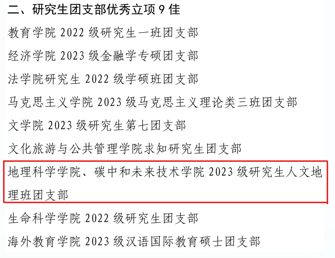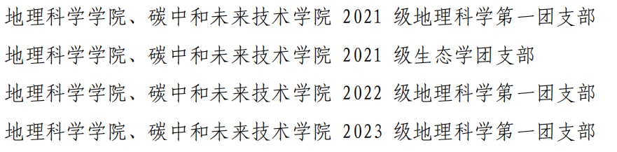 近期,校团委公布优秀立项所在团支部名单。经学院推荐、校团委组织评审,评选产生本科生团支部优秀立项 100 佳、研究生团支部优秀立项 9 佳、学生社团团支部优秀立项 9 佳、学生会(研究生会)团支部 9 佳。其中,我院本科生4个团支部立项入选本科生团支部优秀立项 100 佳,研究生人文地理班团支部立项入选学生会(研究生会)优秀立项 9 佳。