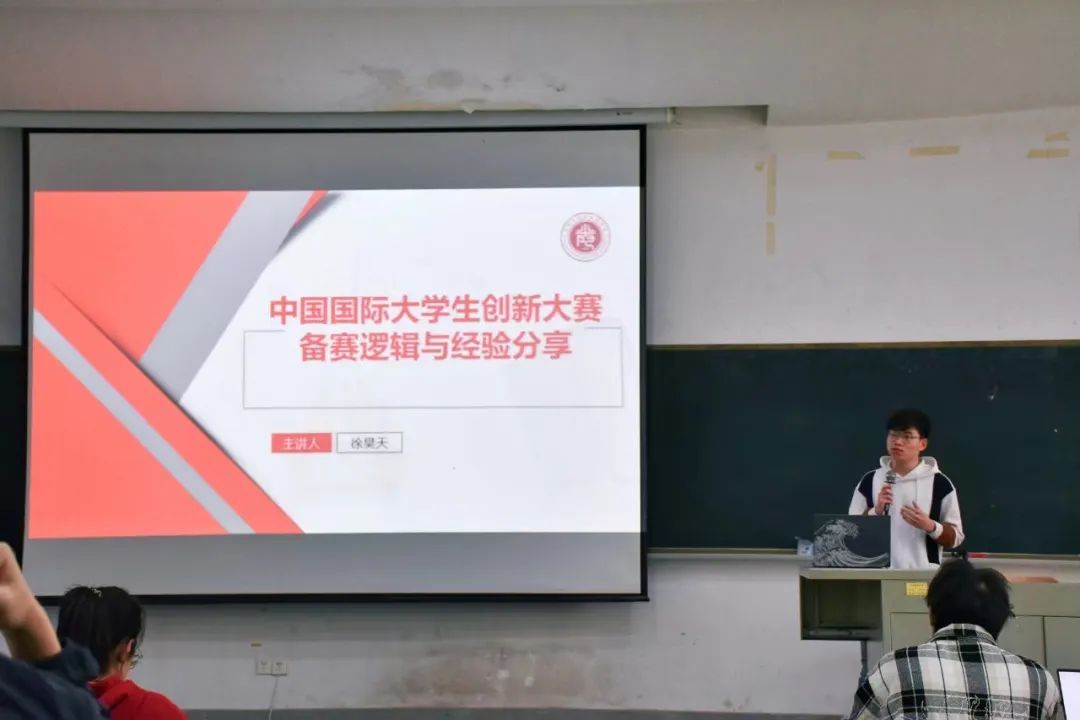 本次培训班由两部分组成,第一部分由光电与信息工程学院徐昊天同学作题为《中国国际大学生创新大赛备赛逻辑与经验分享》的分享。徐昊天从赛事介绍、组别对比、PPT制作逻辑和备赛经验分享等四个部分入手,为参会大学生骨干同学传授经验。徐昊天鼓励同学们加强创新思维的培养与实践,在备赛过程中敢于尝试新思路和方法。