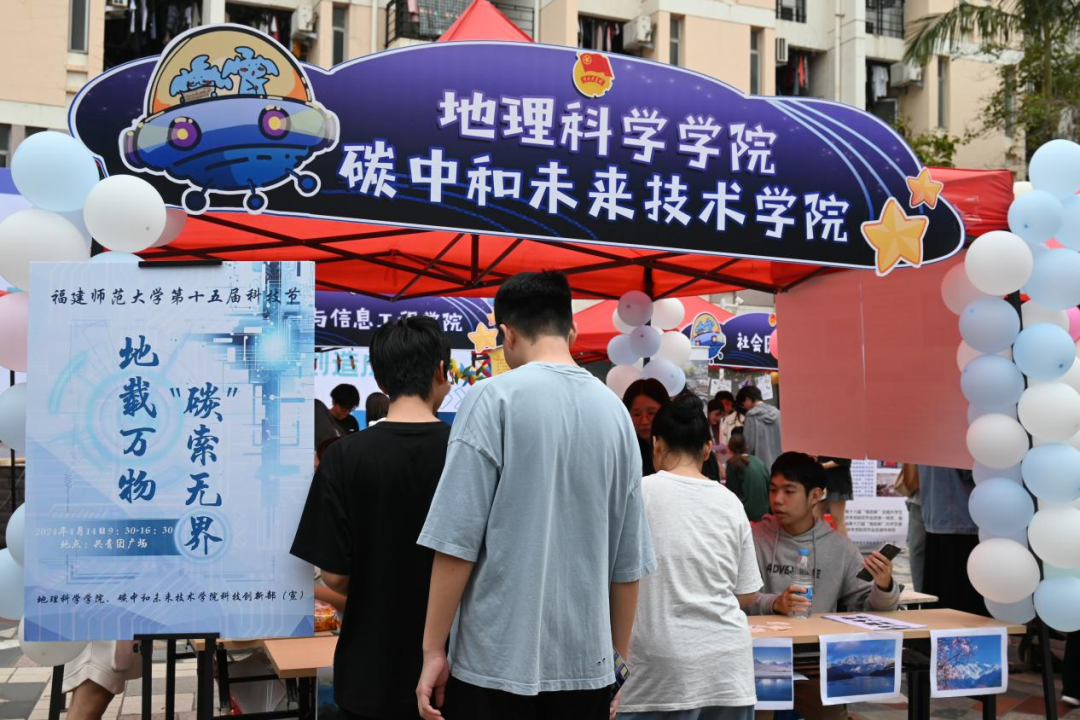 4月14日,福建师范大学第十五届科技节活动在旗山校区共青团广场举行。我院以“地载万物,‘碳’寻无限”为主题参与科技节活动,为参与同学介绍地理相关的科技创新与未来产业。
