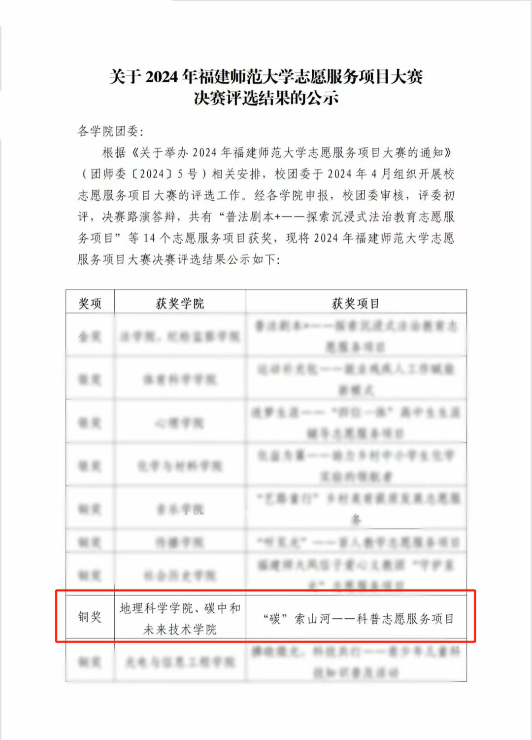 为学习宣传贯彻党的二十大精神,进一步深化和拓展新时代文明实践工作,大力弘扬“奉献、友爱、互助、进步”的志愿精神,引导更多的人参与志愿服务、弘扬志愿精神、传播志愿文化,4月17日,2024年福建师范大学志愿服务项目大赛决赛于索莱达大楼举办,本次共有14个项目进入决赛,我院“‘碳’索山河”——科普志愿服务项目(指导老师:邹秀琦)荣获铜奖。
