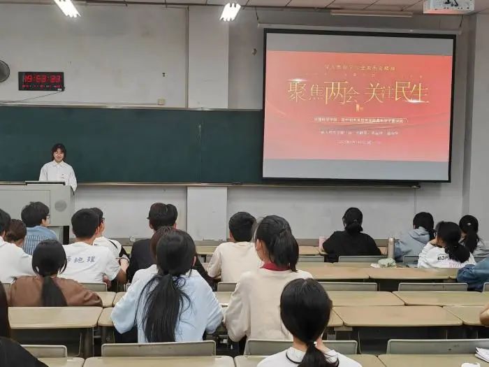 为加强学生思想政治教育,深入学习贯彻全国两会精神,切实把思想和行动统一到各项建设中。我院2023级地理科学第一团支部邀请学院青年学子宣讲团薪火相传专题小组成员,开展了题为“聚焦两会,关注民生”的主题宣讲活动。宣讲会的最后,宣讲团成员呼吁大家要以此次宣讲为契机,深学细研全国两会精神,将全国两会精神贯穿于我们的日常学习生活之中。学习全国两会精神是一项长期而重要的任务,需要我们不断地深化理解、积极践行,始终坚持以习近平新时代中国特色社会主义思想为指导,将学习成果转化为推动学生前进的动力,不断探索学生学习工作的新思路、新方法。