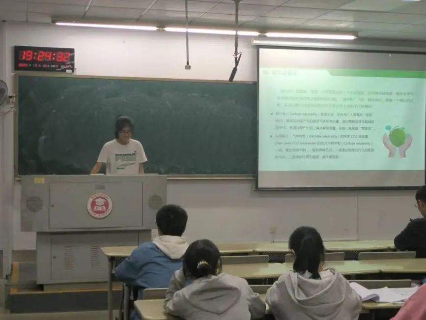 习近平总书记在党的二十大报告中提出:“积极稳妥推进碳达峰碳中和。”为深入学习习近平总书记重要讲话精神,我院青年学子宣讲团面向2023级生态学本科生开展“碳中和小科普——身边碳中和事例”主题宣讲活动,以此加深团员们对碳达峰碳中和理念的理解,鼓励团员努力奋发,积极进取,用自己的智慧为祖国建设奉献力量。本次宣讲活动的成功举办让同学们肩负起碳中和的责任,为地球的生态环境和人类的未来发展贡献自己的一份力量,携手推动碳中和技术的发展,共创一个可持续的未来。