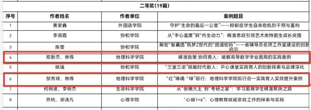 其中,我院郑新杰老师、林伟副书记的《精准施策 协同育人:破解高等数学学业困局的实践案例》,邹秀琦老师、林伟副书记的《“红”铸魂·“绿”砺行:地理科学学院知行合一实践育人实效提升案例》荣获二等奖。