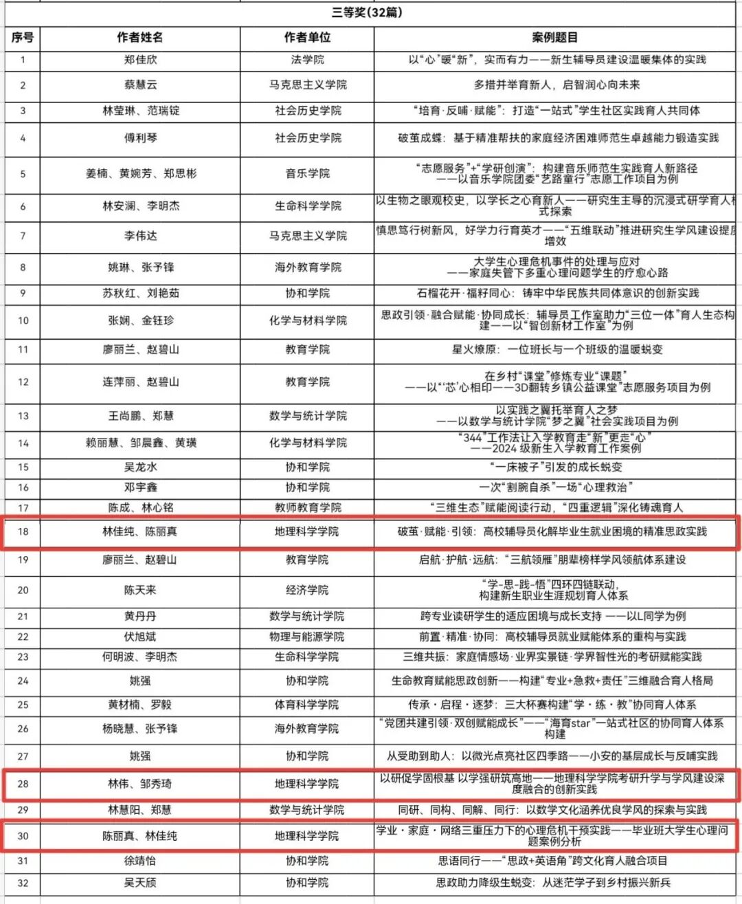 林伟副书记、邹秀琦老师的《以研促学固根基 以学促研筑高地——地理科学学院考研升学与学风建设深度融合的创新实践》,林佳纯、陈丽真老师的《破茧·赋能·引领:高校辅导员化解毕业生就业困境的精准思政实践》,陈丽真、林佳纯老师的《学业·家庭·网络三重压力下的心理危机干预实践——毕业班大学生心理问题案例分析》荣获三等奖。