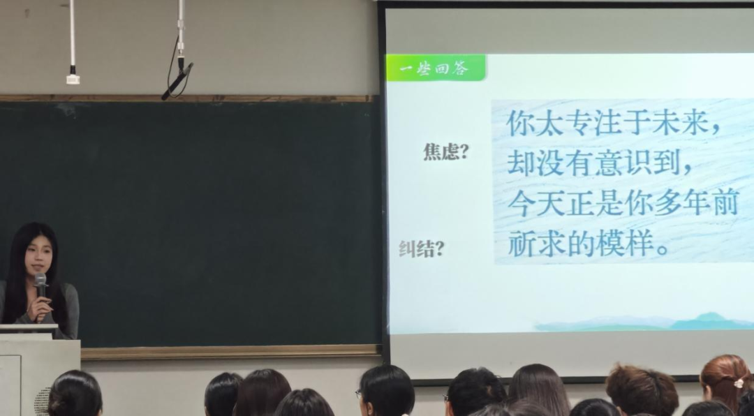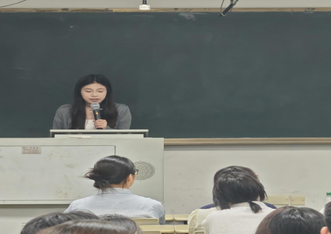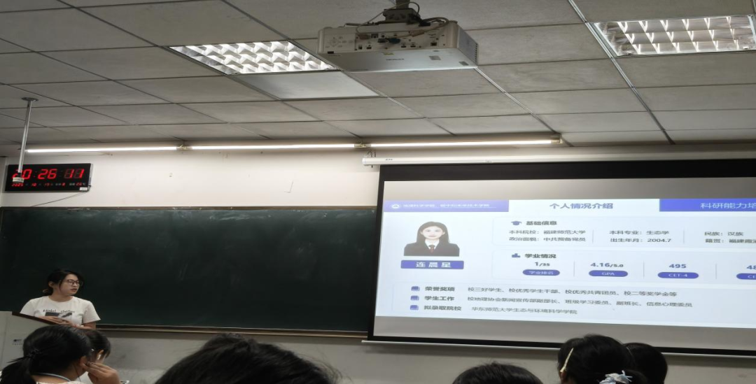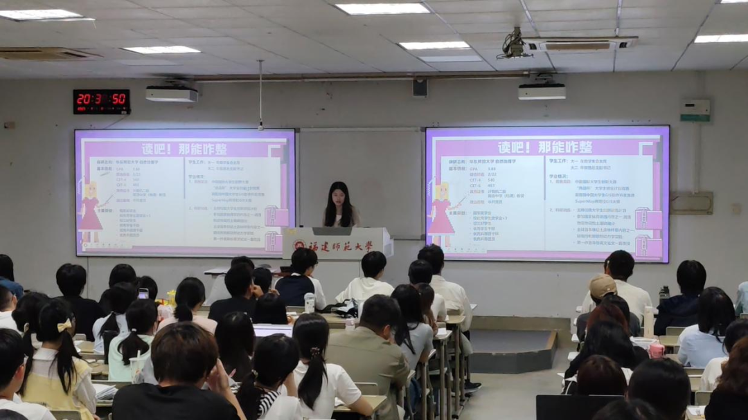 她站在讲台前,用清晰的“自我介绍”PPT,把“如何平衡学习、工作与科研”的秘籍,毫无保留地分享给学弟学妹们。