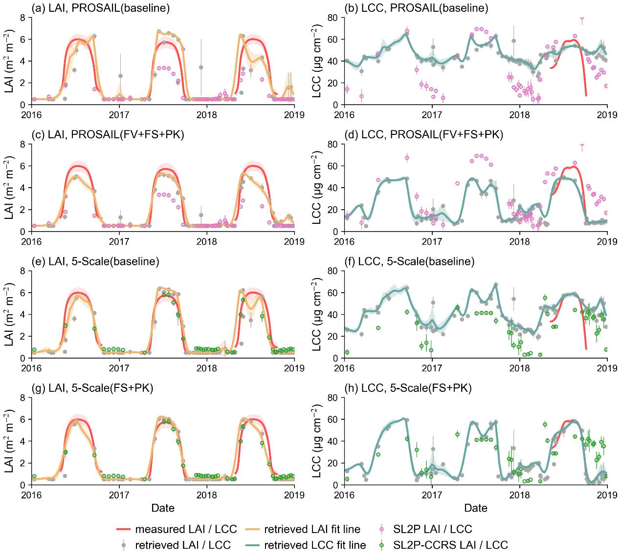 图为示例落叶阔叶林站点实测与反演平均LAI(左列)和LCC(右列)的季节变化。反演LAI和LCC采用4种算法获得:PROSAIL (baseline) (a–b)、PROSAIL (FV+FS+PK) (c–d)、5-Scale (baseline) (e–f)和5-Scale (FS+PK) (g–h)。此外,还纳入两种开放获取算法SL2P和SL2P-CCRS进行对比。
