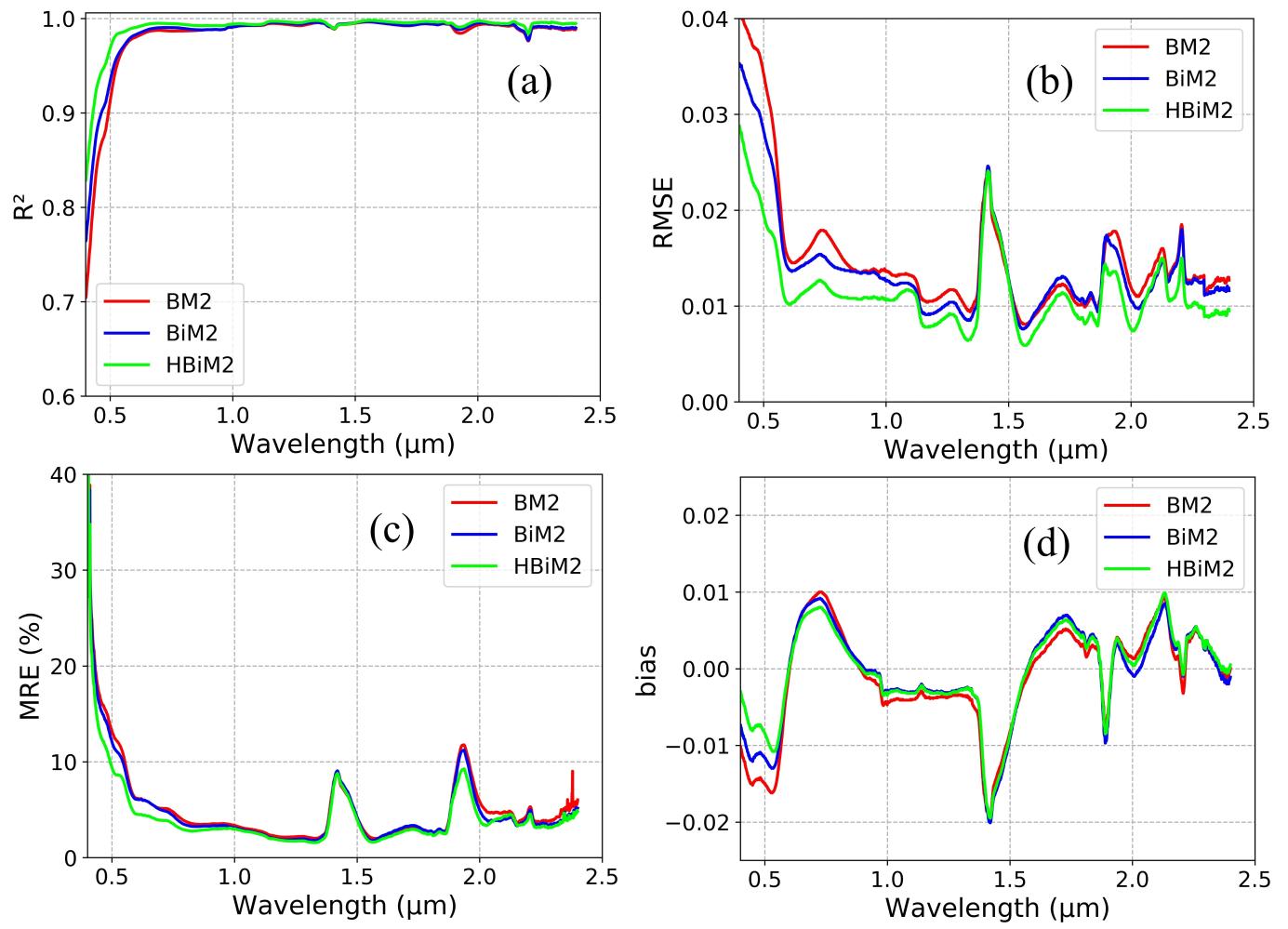 图为不同模型在0.4-2.4 μm光谱范围内的土壤反射率拟合精度对比。黑色、红色和蓝色分别表示BM2、BiM2和HBiM2模型。图中展示了三种模型在可见光至短波红外波段内对土壤反射率的拟合效果,对比评估了模型在光谱范围内的表现差异及HBiM2模型的改进优势。